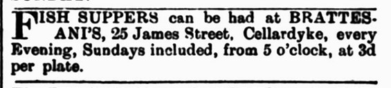 FRIED FISH and POTATOE SUPPERS can be had at 25 James Street, Cellardyke, on and after THURSDAY, 28th Met., from 6 p.m to 12 p.m. except Saturdays from 12 noon to 12 p.m., and Sunday, 12 noon to 10 p.m., at 3d per plate. – East of Fife Record 6th Oct 1906